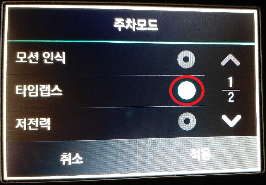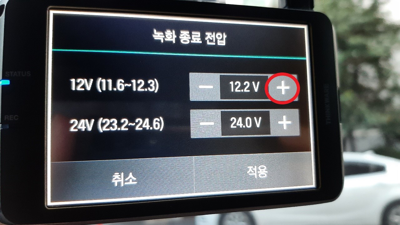 녹화 종료 전압 창의 상단 "+" 버튼을 터치하여 12.2V로 만들어 주고, "적용" 버튼을 터치해서 주차모드 설정을 마쳤습니다.
