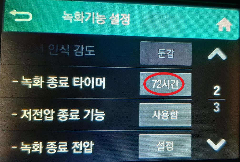 2페이지로 "녹화 종료 타이머" 의 오른쪽 버튼이 "72시간" 이 될 때까지 여러 번 터치해 줍니다.