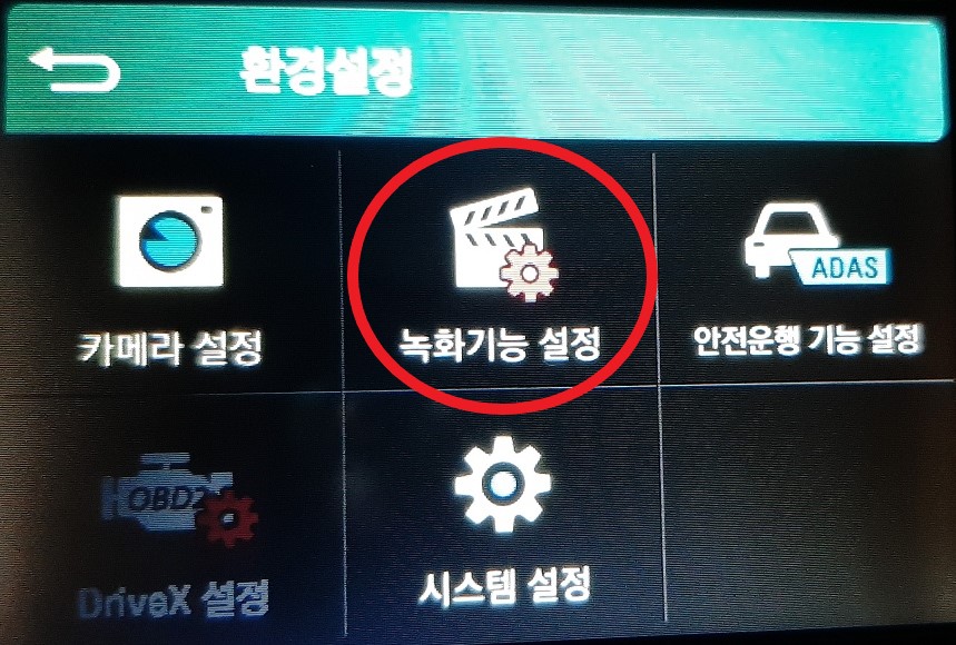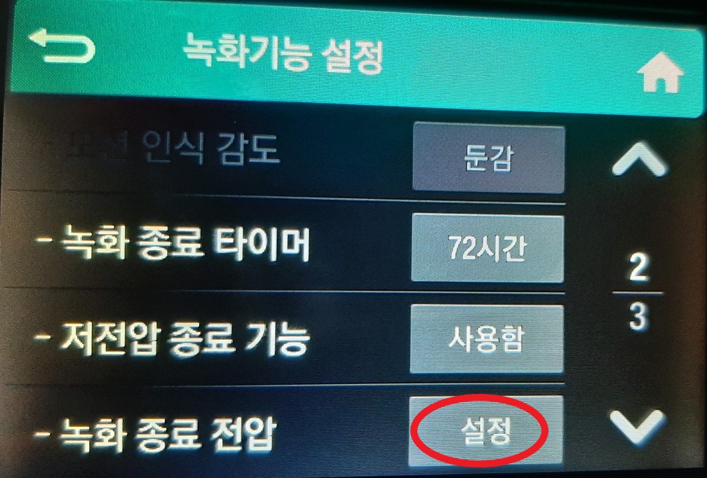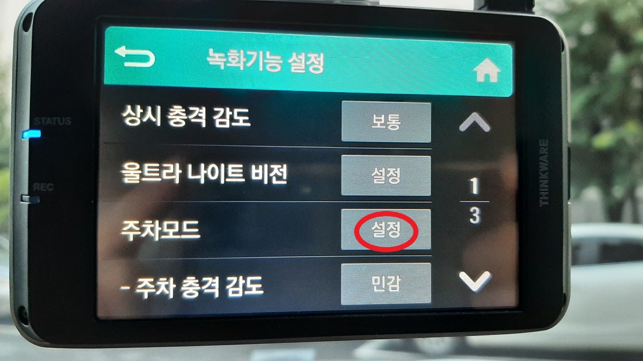 환경설정 메뉴에서 녹화기능 설정 메뉴를 터치하면 주차모드 설정을 바꿀 수 있습니다.
