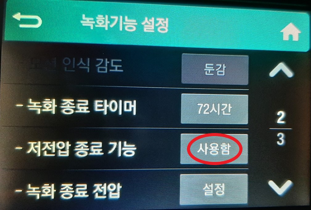 "저전압 종료 기능" 의 오른쪽 버튼을 터치하여 "사용함" 으로 만들어 줍니다.