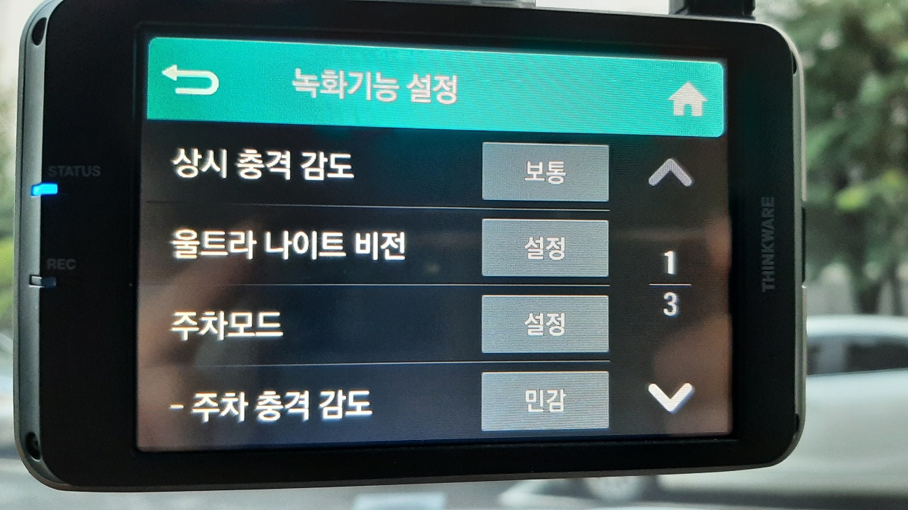 "주차 충격 감도" 오른쪽 버튼이 "민감" 이 될 때까지 여러 번 터치해 줍니다.