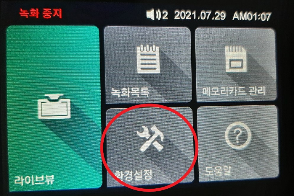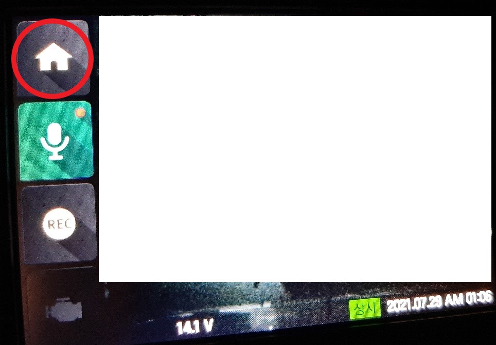 블랙박스의 라이브뷰 화면에서 홈 모양 버튼을 터치하여 홈 메뉴로 들어갑니다.