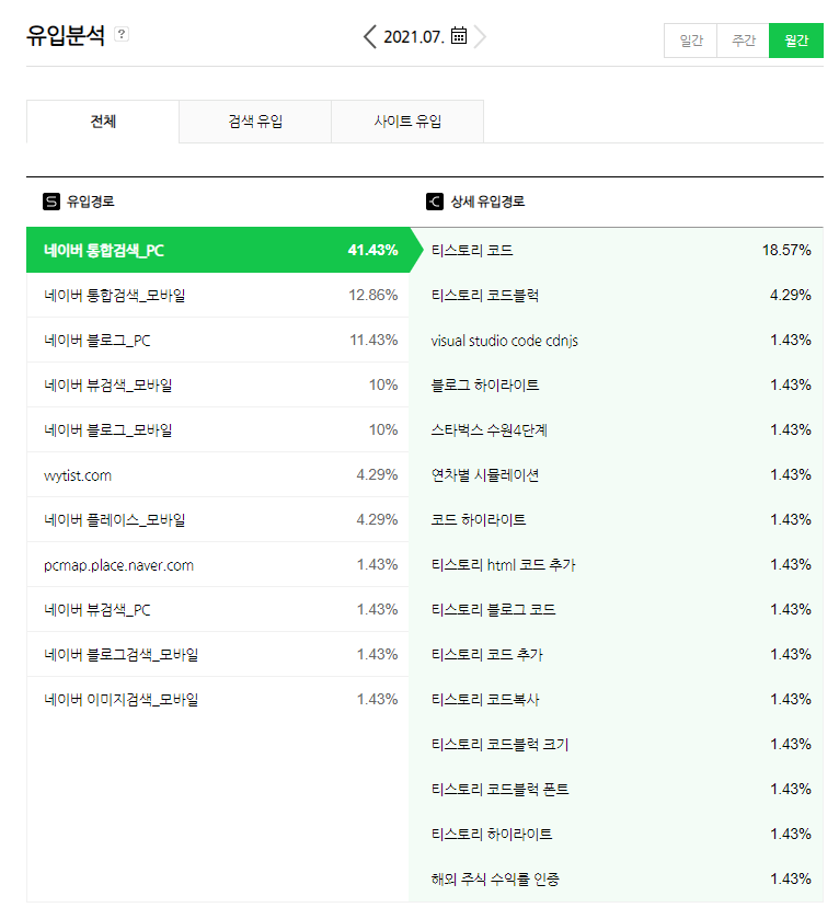 저는 이 데이터가 제일 흥미로웠는데요, 가장 높은 비중을 차지하는 유입소스가 네이버 통합검색에서 "티스토리 코드"로 검색한 결과라는 것입니다. 어쩌면, 네이버 블로그를 하시는 분들 중에 티스토리 블로그도 같이 하시는 분이 많다는 과잉해석을 해봅니다. ㅎ