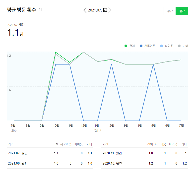 7월의 평균 방문 횟수는 1.1이네요. 즉, 아직은 재방문율이 거의 제로에 가깝다는 의미입니다. 구독자를 늘리고, 재방문을 유도할 수 있는 컨텐츠를 생산한다는 것이 얼마나 어려운 일인지 다시 한번 뼈저리게 느껴지는 데이터입니다.