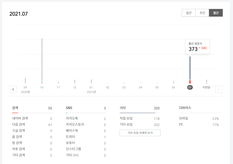 포스트를 다시 작성하기 시작한 7월에는 전 달 대비 방문수가 340회 더 증가했네요. 하지만, 검색이나 SNS를 통해서 유입된 수는 50회 정도밖에 안 되는 걸 보니, 절반 정도의 트래픽은 제가 포스트를 작성하느라 접속한 기록이 아닐까 싶습니다.