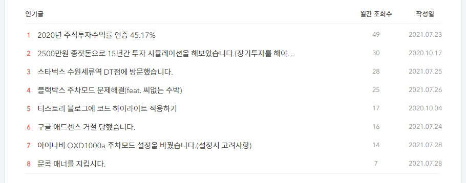 역시 블로그를 다시 열심히 작성하기 시작한 7월에 조회수가 전달대비 62회 증가한 86회로 약 358% 증가했네요. 하지만, 네이버 블로그의 조회수도 모수가 굉장히 작기 때문에 허수의 비율이 상당히 높을 겁니다.