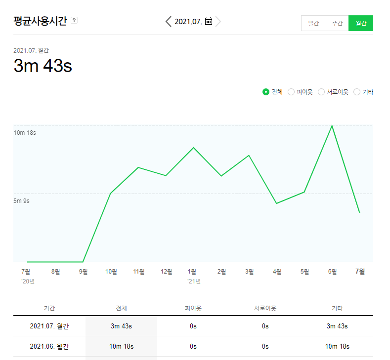 포스트를 작성하지 않은 6월보다도 평균 사용 시간이 줄었네요. 이건 아마도 포스트를 작성하면서 빠르게 들락날락한 허수 방문 시간 때문이 아닌가 하는 생각을 해봅니다.