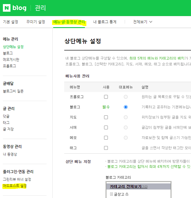 "메뉴.글.동영상 관리 메뉴" 페이지에서 좌측의 "애드포스트 설정" 메뉴를 클릭해줍니다.