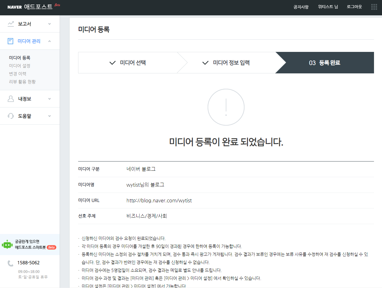 미디어 등록이 완료되면, "등록완료" 페이지가 뜹니다. 이제 검수를 기다리는 일만 남았네요.
