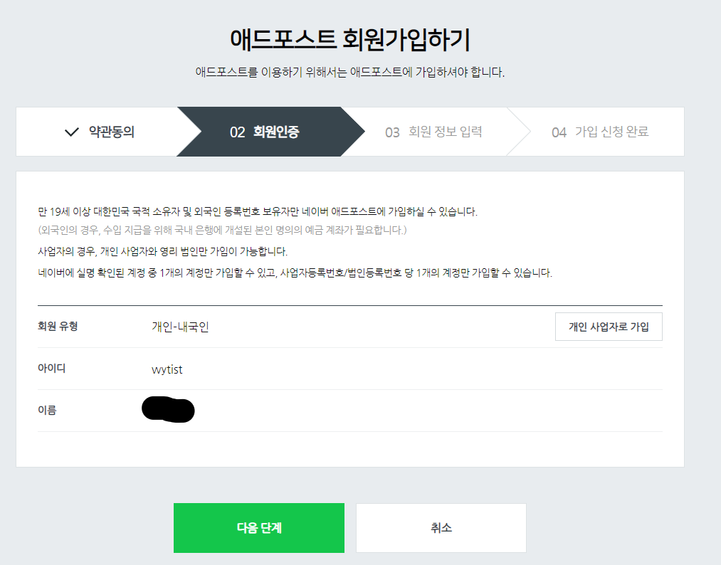 두 번째 단계는 "회원인증" 단계입니다. 만약 개인사업자로 가입하고 싶으신 분은 "개인 사업자로 가입" 버튼을 클릭해서 가이드대로 신청하시면 됩니다. 저는 사업자가 없어서 "개인-내국인" 유형으로 가입했습니다. 하단에 있는 "다음 단계" 버튼을 클릭해 줍니다.