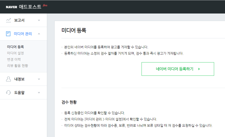 "미디어 등록" 페이지에서 "네이버 미디어 등록하기" 버튼을 클릭합니다. 등록한 미디어에는 검수 후에 통과 시 광고가 게재된다고 하네요.