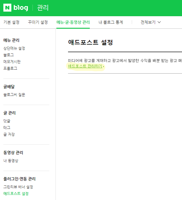 1. 블로그 관리 메뉴에서 애드포스트 설정 페이지 찾기