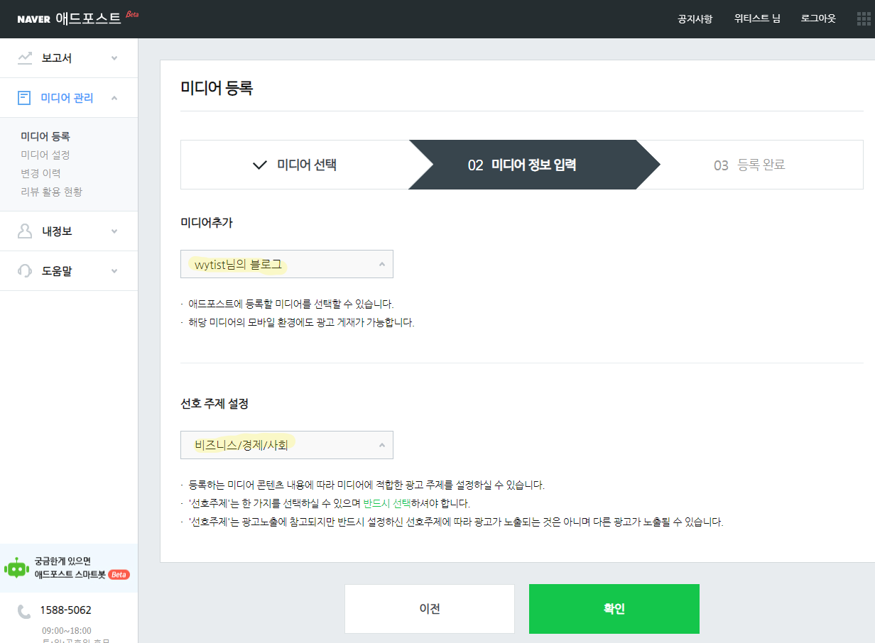 미디어 등록 2단계는 "미디어 정보 입력" 단계입니다. "미디어추가" 메뉴에서 자신의 미디어(저는 블로그)를 선택하고, "선호 주제 설정"에서 적절한 카테고리를 선택하고, "확인" 버튼을 클릭합니다.