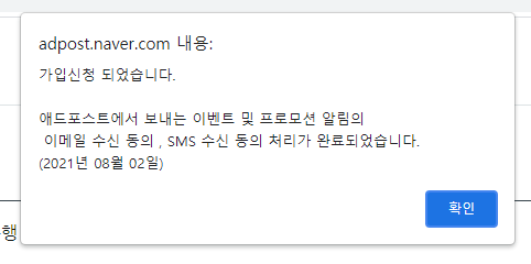 애드포스트 회원가입이 완료되면 위와 같이 가입 완료 메시지가 뜹니다. "확인" 버튼을 눌러 애드포스트 관리 사이트로 접속합니다.