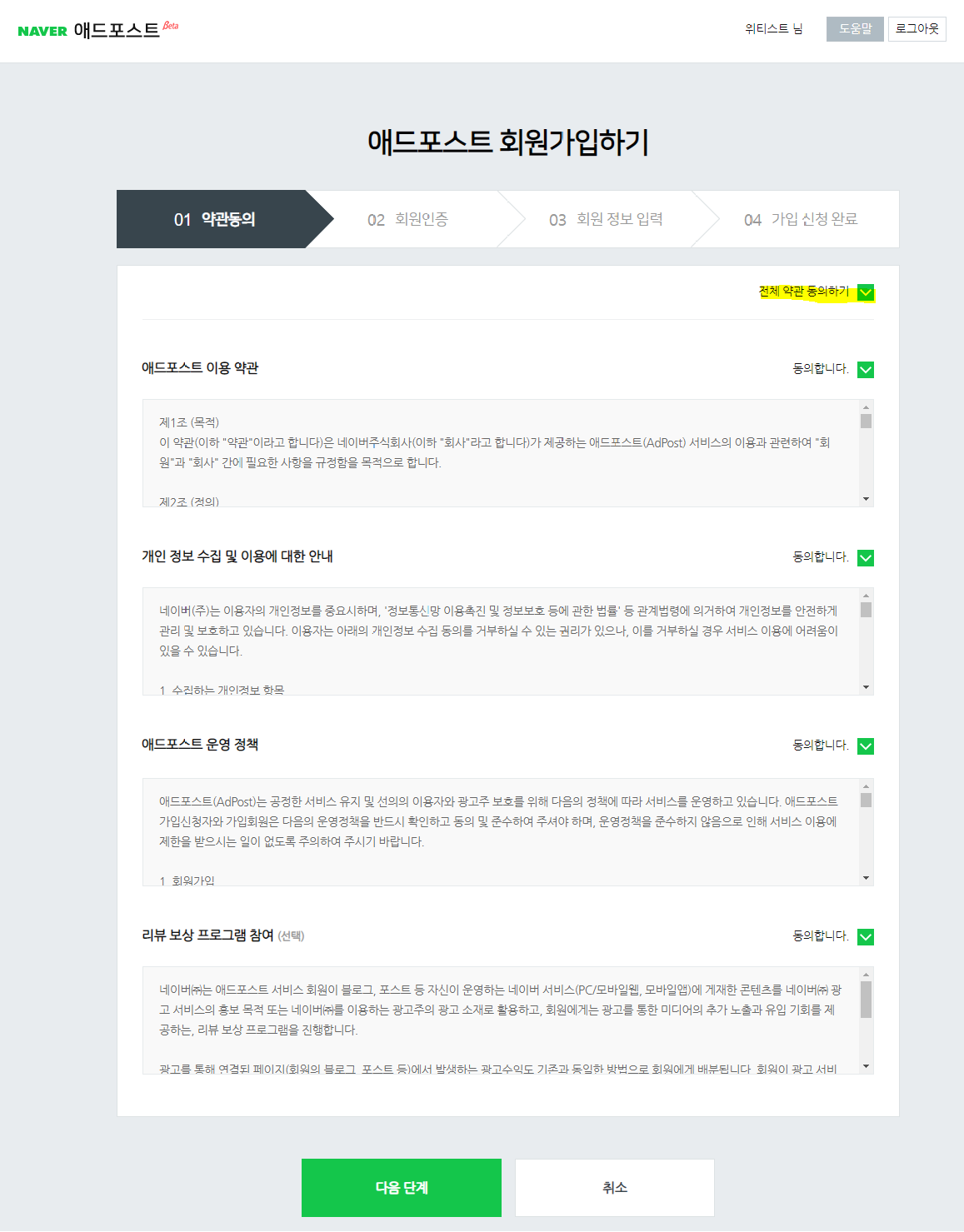 "애드포스트 회원가입하기" 페이지의 첫 번째 단계에서 "전체 약관 동의하기" 항목을 체크하고, 하단의 "다음 단계" 버튼을 클릭해서 다음 단계로 넘어가 줍니다. "리뷰 보상 프로그램 참여" 항목은 선택사항이고, 원하시면 가입 후에 동의를 취소할 수 있습니다.