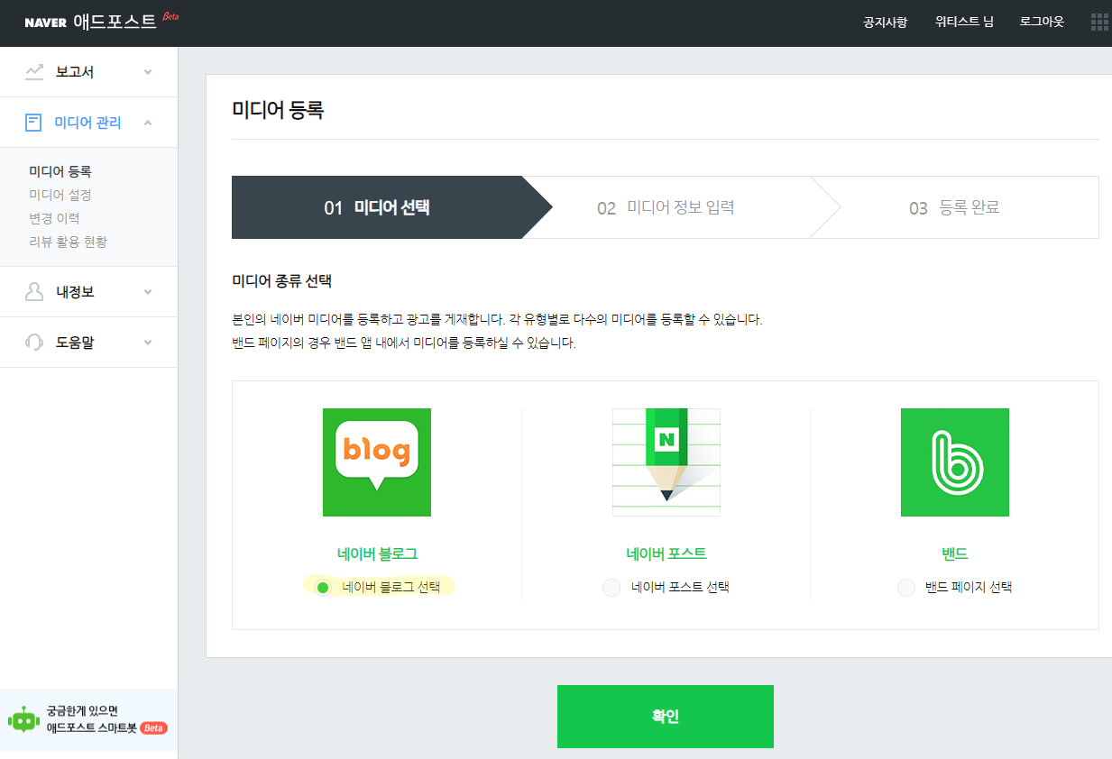 미디어 등록의 1단계로 광고를 게재할 "미디어 선택"을 합니다. 자신이 보유한 "네이버 블로그", "네이버 포스트", "밴드" 중에 선택이 가능한데, 저는 블로그를 가지고 있어서 "네이버 블로그"를 선택하고 "확인" 버튼을 클릭합니다.