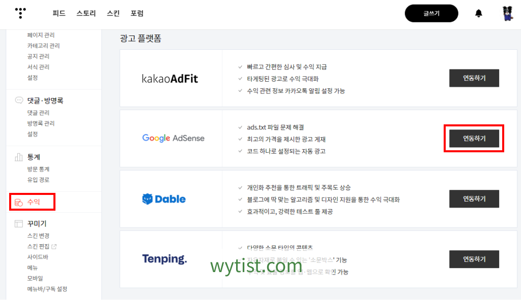 티스토리 관리자에서 좌측 패널의 수익 버튼을 클릭하여 수익 페이지로 이동한 후, 광고 플랫폼 섹션의 Google AdSense 패널의 우측에 있는 연동하기 버튼을 클릭하여 연동 메뉴를 활성화 해줍니다.
