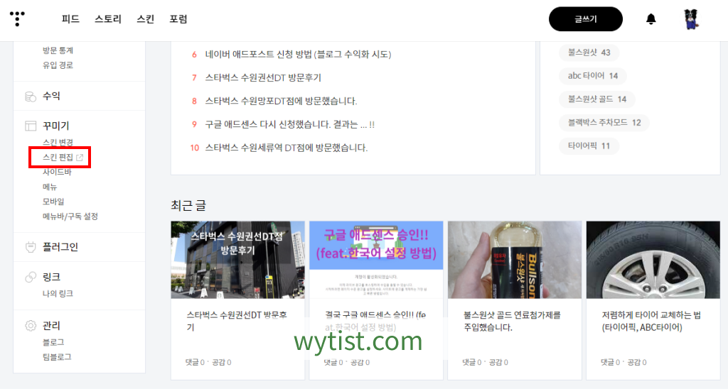 티스토리 관리자 페이지로 이동하여 좌측 패널에서 스킨 편집 메뉴를 클릭해 줍니다.