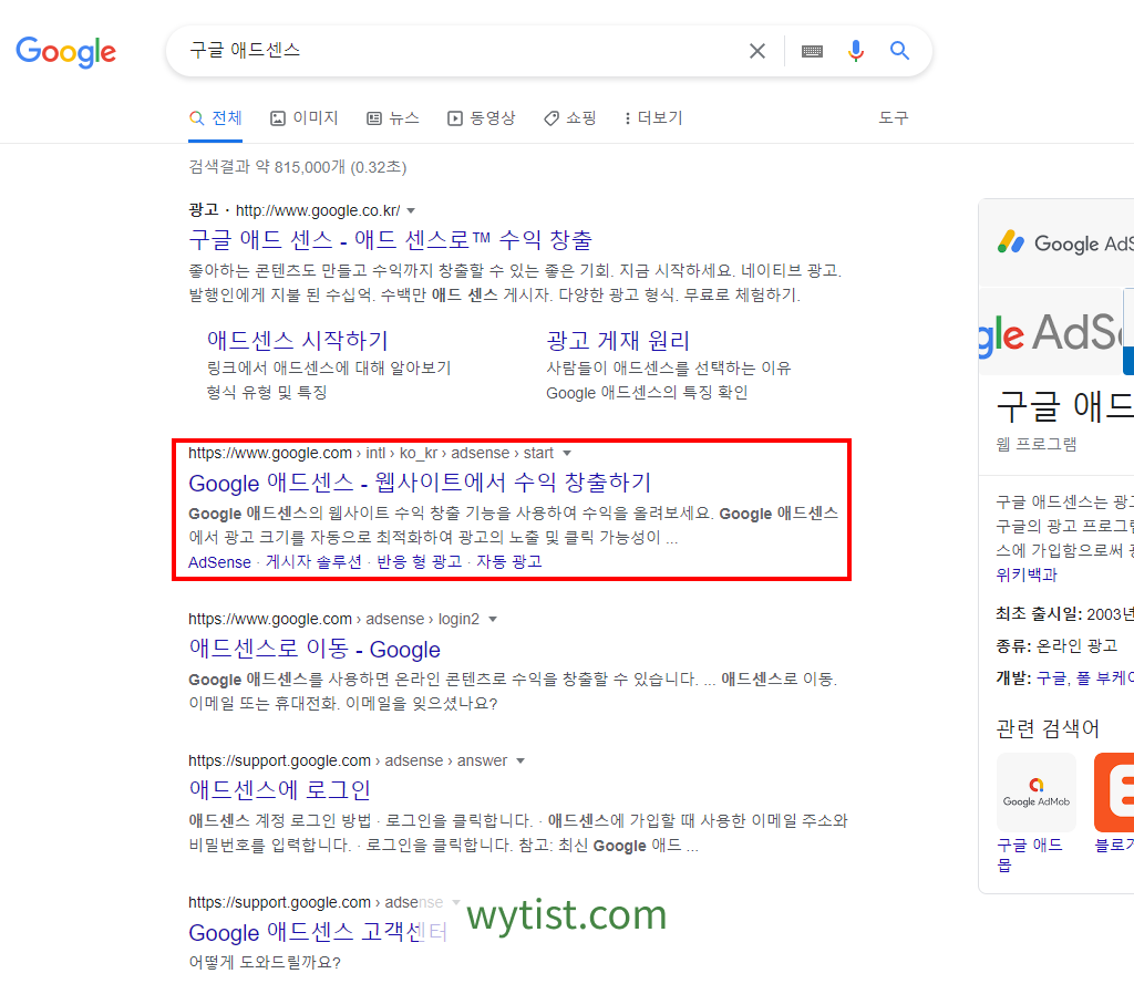 우선 구글에서 "구글 애드센스"를 검색합니다. 검색결과에서 위 화면에 표시된 사이트 링크를 클릭하여 이동합니다.