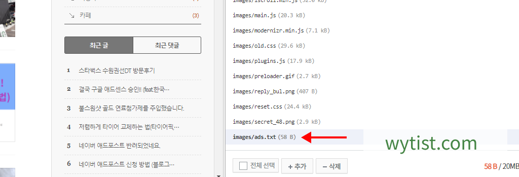 html 편집 페이지로 이동한 후, 우측 상단의 파일업로드 탭을 선택한 후, 우측 하단에 있는 + 추가 버튼을 클릭하여 다운 받아놓은 ads.txt 파일을 업로드 해줍니다.
