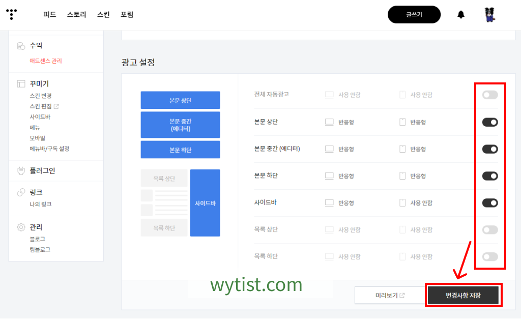 애드센스 관리 페이지에서는 수익 통계를 확인하고 광고 설정을 할 수 있습니다. 저는 위 화면처럼 목록 상/하단을 제외한 모든 영역에 구글 애드센스 광고가 표시되도록 설정했습니다. 목록 상/하단에 광고를 표시하려면 스킨 코드를 수정해야 합니다. 그건 다음 편에서 ~