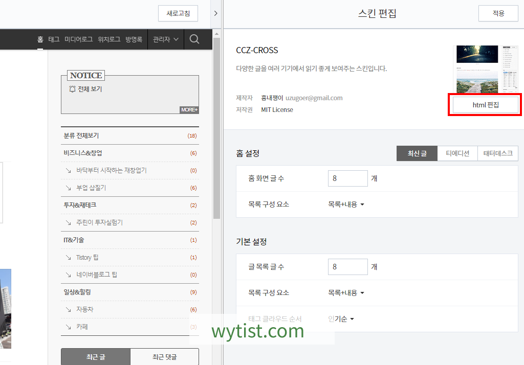 스킨 편집 페이지로 이동하면 우측 상단에 있는 html 편집 버튼을 클릭해 줍니다.