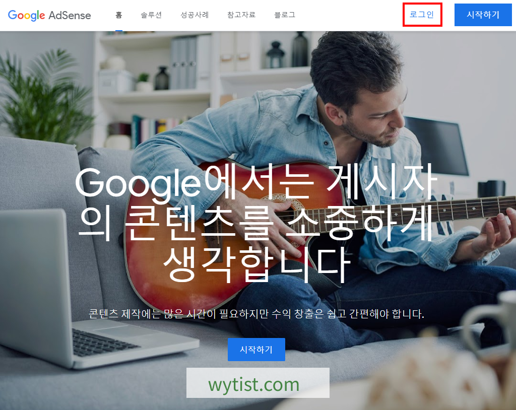 구글 애드센스 사이트로 이동하면 우측 상단에 있는 로그인 버튼을 클릭하여 로그인을 진행합니다.