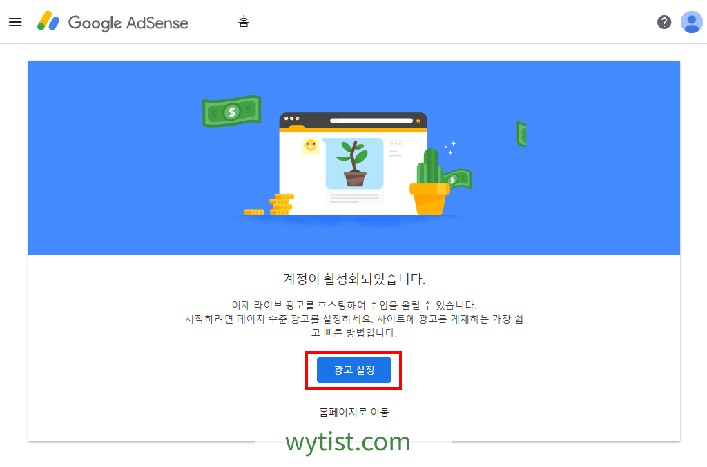 로그인 후에는 위 화면처럼 광고계정이 활성화되었다는 메세지를 볼 수 있습니다. 화면 중앙 하단에 있는 광고 설정 버튼을 클릭해 줍니다.
