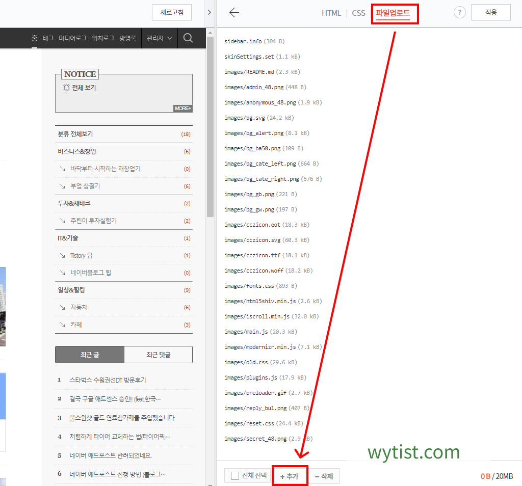 html 편집 페이지로 이동한 후, 우측 상단의 파일업로드 탭을 선택한 후, 우측 하단에 있는 + 추가 버튼을 클릭하여 다운 받아놓은 ads.txt 파일을 업로드 해줍니다.