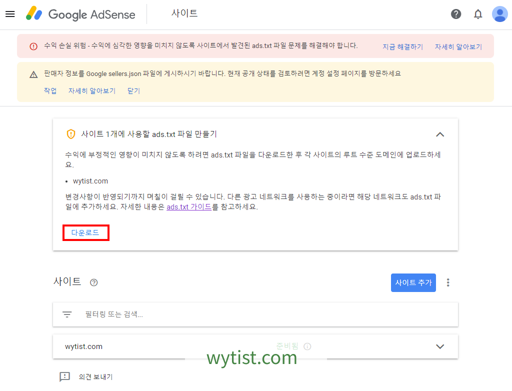 이동된 페이지에서 화면에 표시된 다운로드 링크를 클릭하여 PC에 ads.txt 파일을 다운로드 해줍니다.