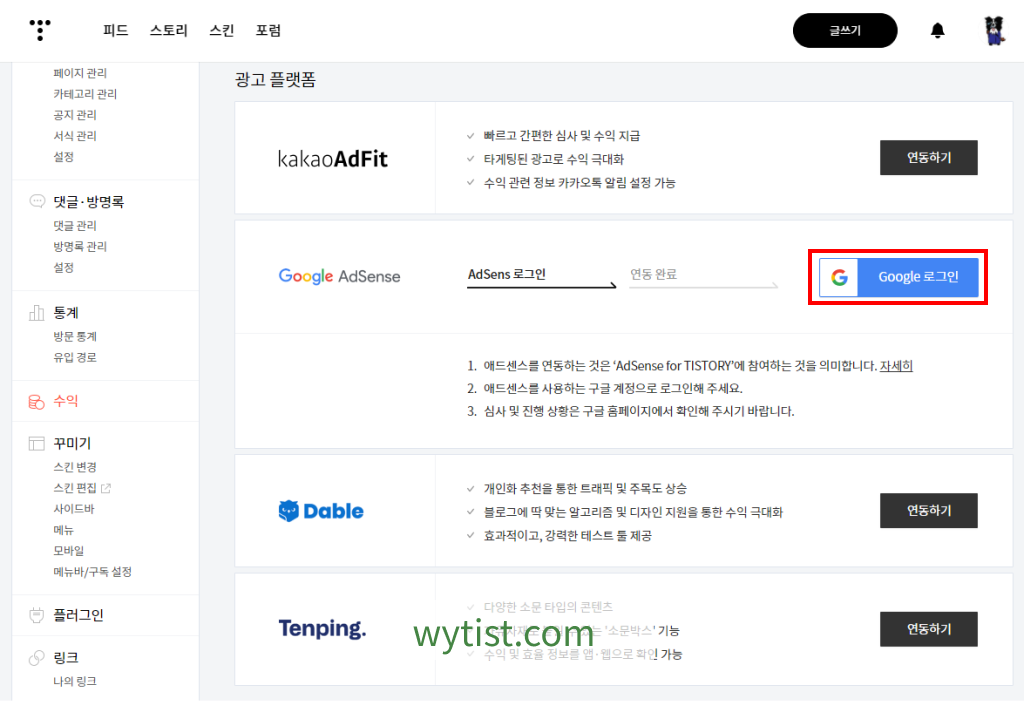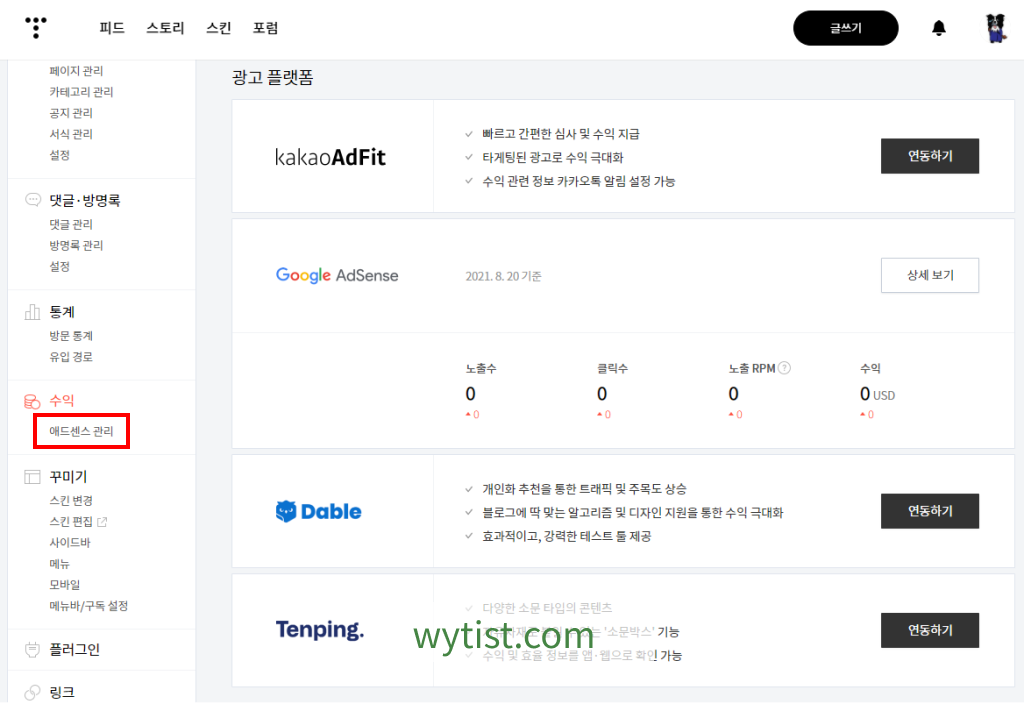 티스토리에 ads.txt 파일을 업로드 한 후에는 티스토리 관리자 페이지에서 구글 애드센스 계정을 연동해 주어야 합니다.