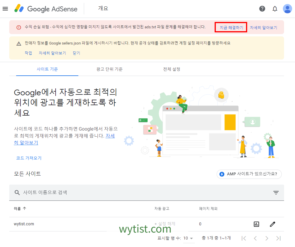 구글 애드센스는 광고 게재 사이트에 설치된 ads.txt 파일을 통해서 사이트를 인증하기 때문에 ads.txt 파일을 다운받아 티스토리에 업로드 하겠습니다. 위 화면에서 지금 해결하기 링크을 클릭해 줍니다.