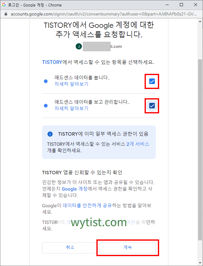 Google AdSense 패널의 우측에 Google 로그인 버튼이 활성화되면 클릭하여 아래 그림처럼 계정 연동을 진행합니다.