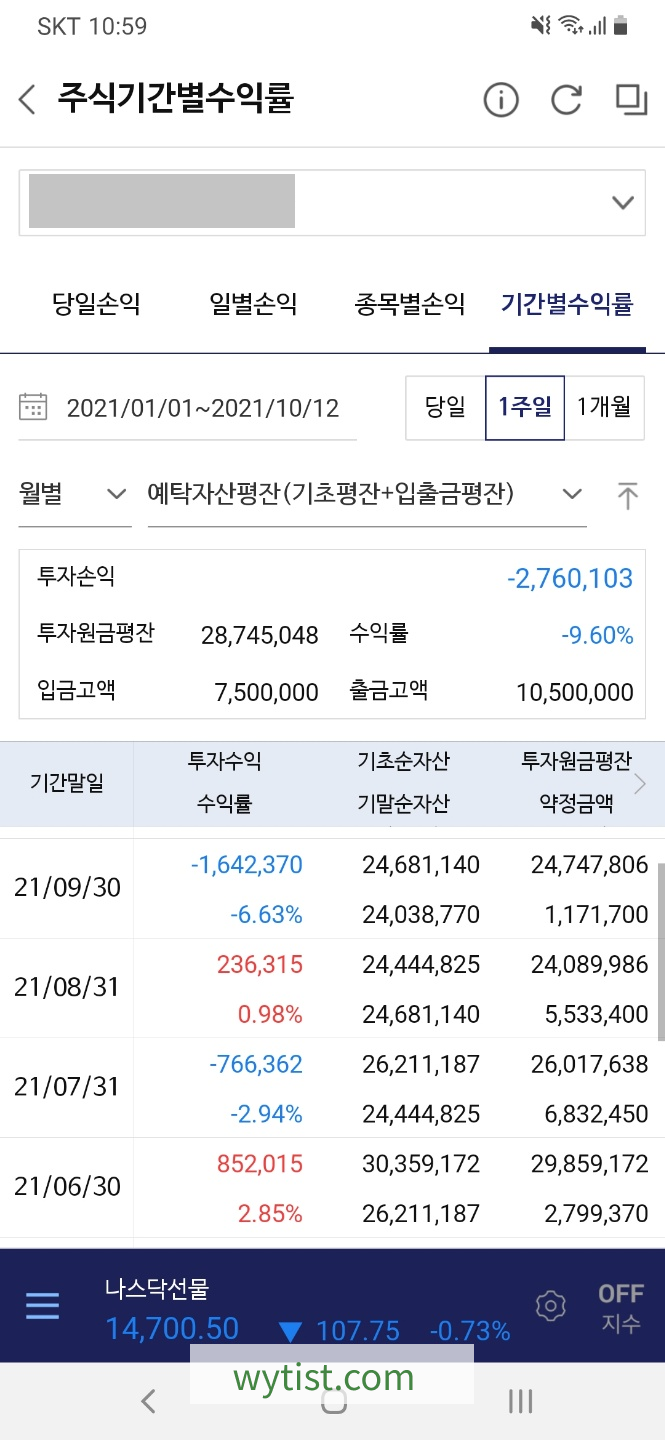 10월 12일 오전 기준으로 올해 수익률은 -9% ~ -11% 사이에 있는 상황입니다. 저는 올 하반기에 최대 실적을 기록하는 우리나라 기업들이 많을 것이라고 생각하고, 조정 후에 결국 상승할 것이라고 생각하기 때문에, 지수가 2,800대로 떨어지면, 보수적으로 추매를 해볼까 생각입니다. (주린이 개인의 의견이기 때문에 재미로 보기만 하세요)