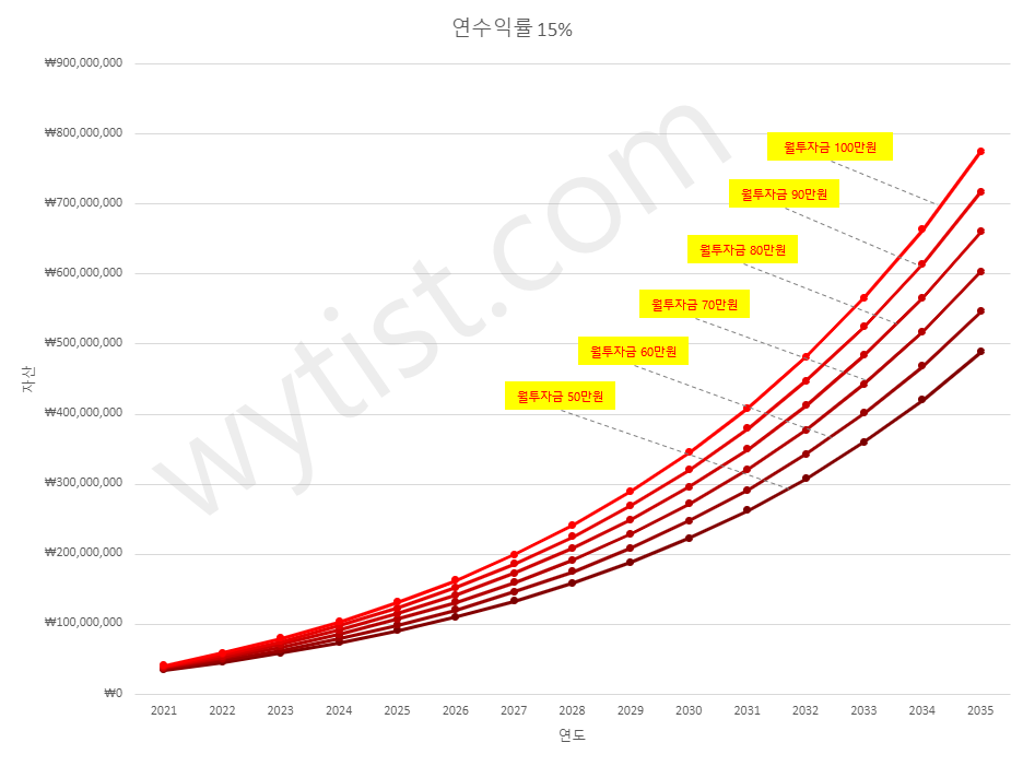 연수익률 15%로 15년을 투자할 경우, 약 5억원에서 8억원 정도의 자산을 만들수 있구요. ^^