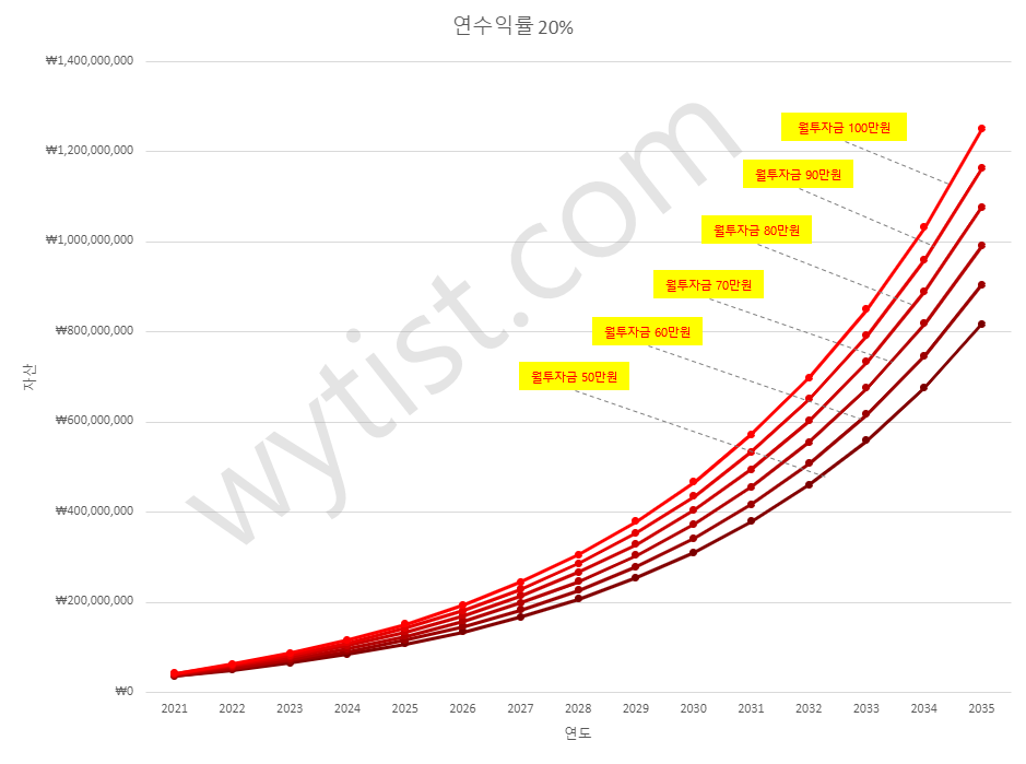 연수익률 20%로 15년을 투자할 경우, 약 8억원에서 12억원 이상의 자산이 생기는군요. :D