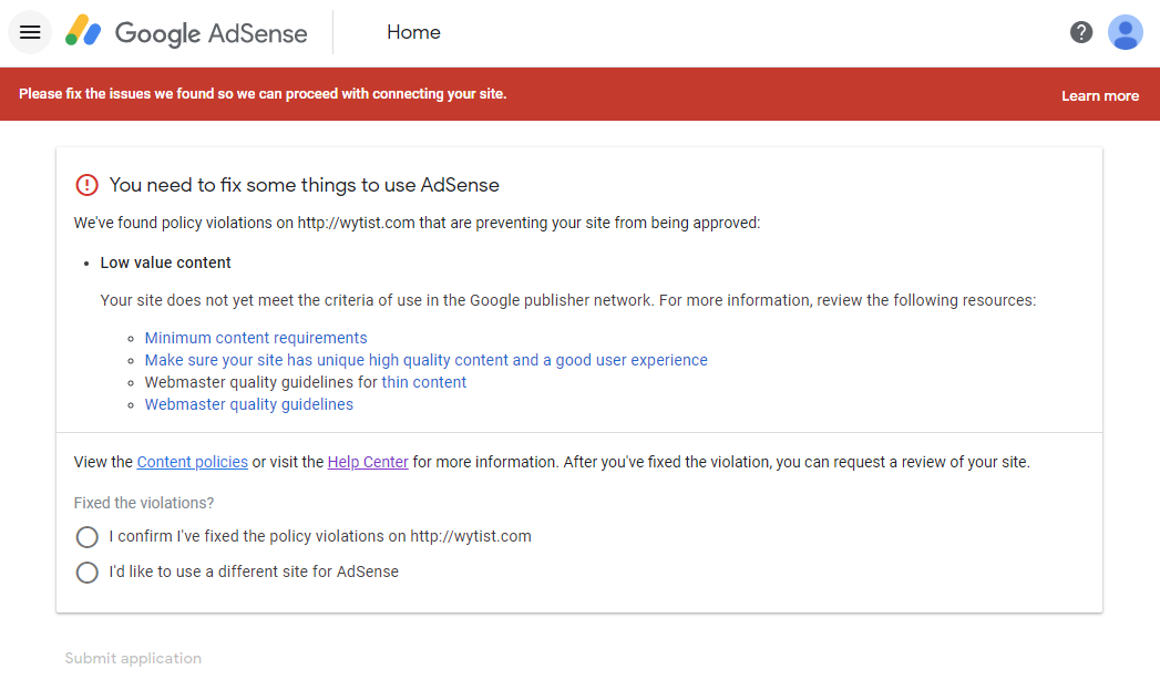 Google의 애드센스 프로그램 정책 은 게시자와 광고주 모두를 위한 Google 광고의 효과를 보장하기 위해 마련되었습니다. 우리는 모든 게시자를 검토하며 모든 신청을 거부할 권리가 있습니다. 프로그램 기준을 충족하도록 변경할 수 있는 경우 나중에 애드센스를 다시 신청할 수 있습니다.